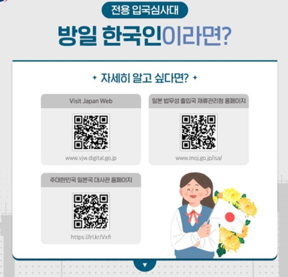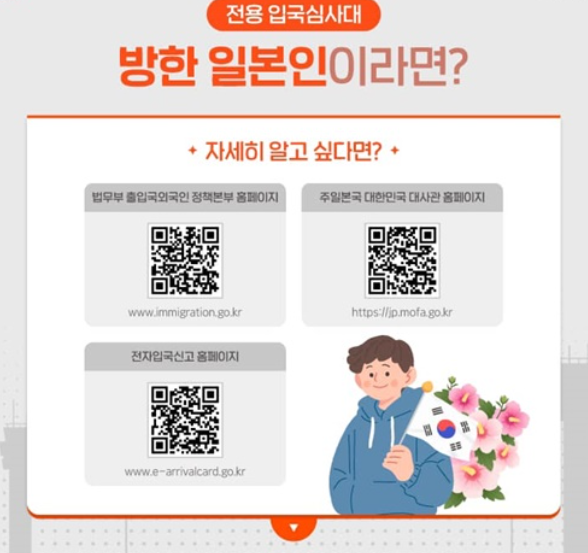 일본인이 한국 입국 시에는 전자입국신고를 완료하고 해당 신고서 또는 캡처 화면을 제시해야 하며, 한국인이 일본 입국 시에는 Visit Japan Web에서 사전 등록을 마친 후 QR코드를 입국장 안내원에게 보여줘야 합니다.